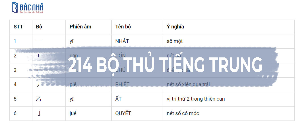Bộ thủ là một phần cơ bản cấu tạo nên chữ Hán. Thông qua bộ thủ bạn có thể nắm sơ qua về ý nghĩa của chữ Hán đó, thông qua bộ thủ việc tra cứu chữ Hán cũng trở nên dễ dàng hơn. Hãy cùng Bacnhabook cùng tìm hiểu về ý nghĩa của các bộ thủ qua bài viết dưới đây nhé!