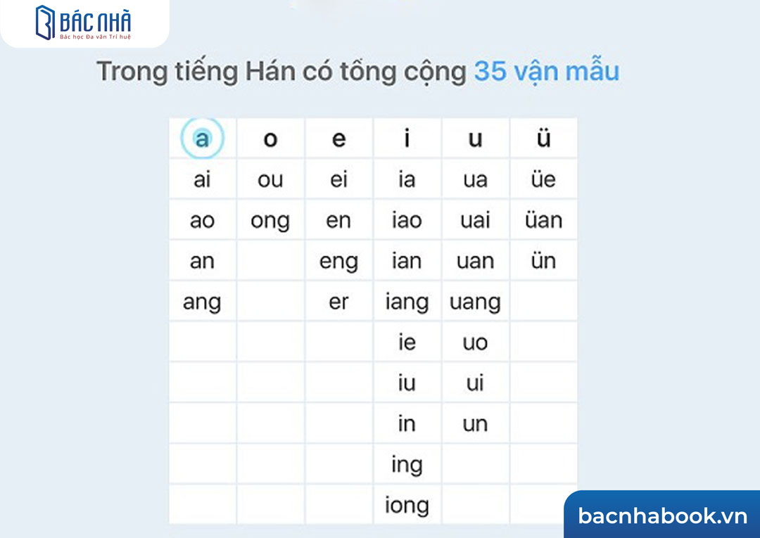 Vận mẫu hay còn được gọi là nguyên âm. Trong tiếng Trung có 35 nguyên âm cụ thể như sau: