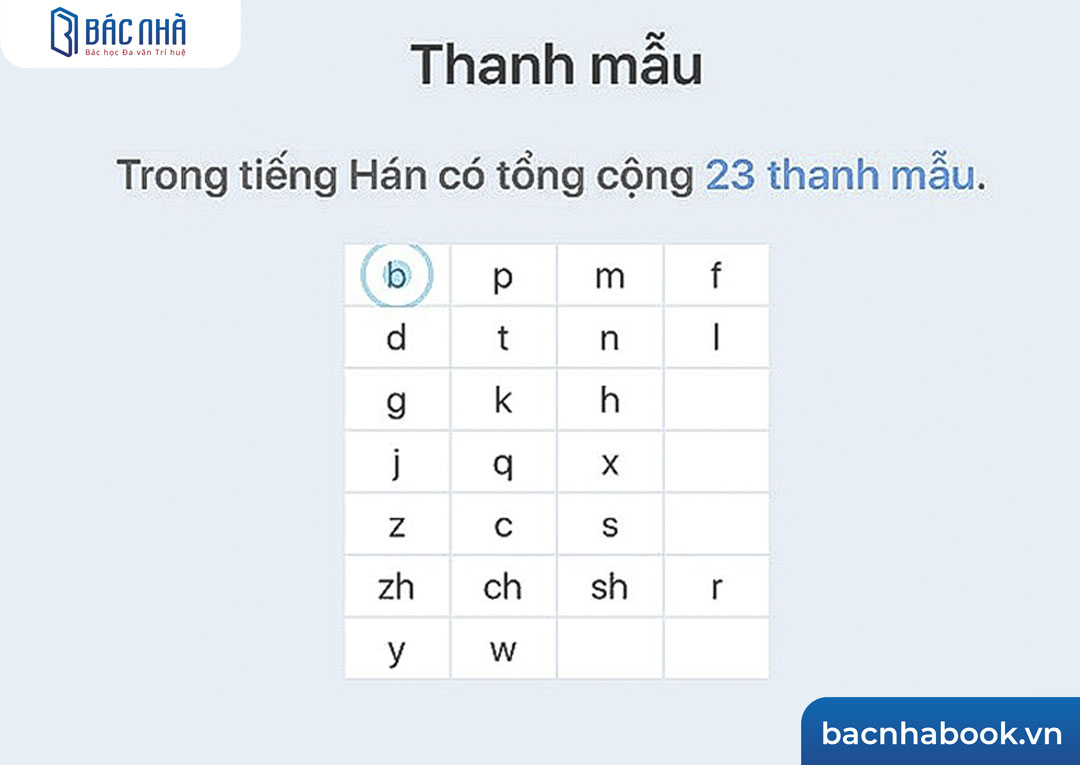 Trong tiếng Trung có tổng cộng 21 thanh mẫu (hay còn gọi là phụ âm). Trong đó bao gồm 18 phụ âm đơn và 3 phụ âm kép.