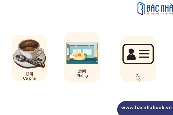 咖啡 | kāfēi | Cà phê | 我喝咖啡。(Wǒ hē kāfēi.) – Tôi uống cà phê. |
